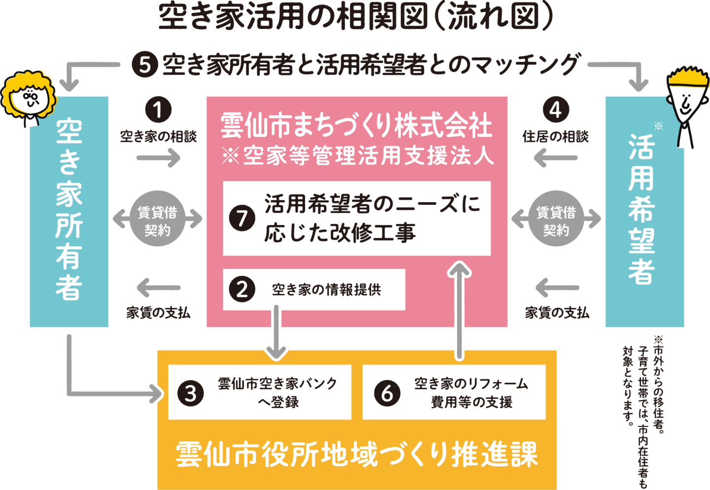 この取り組みは移住希望者の移住・定住を促進する為、雲仙市の【空き家バンク】を活用し、移住希望者と空き家のマッチングと移住希望者のニーズに合わせた改修工事を行い、空き家を移住者に転貸するものです。